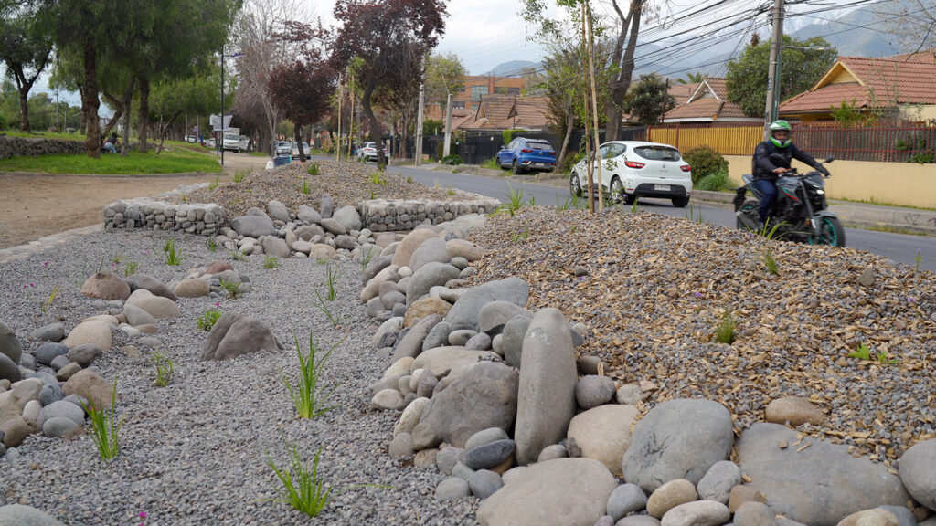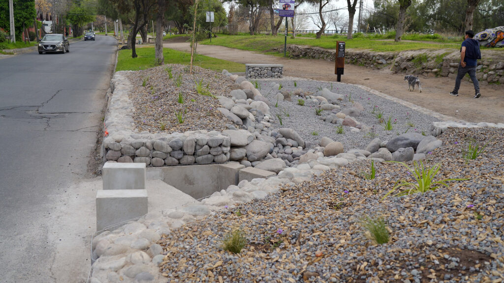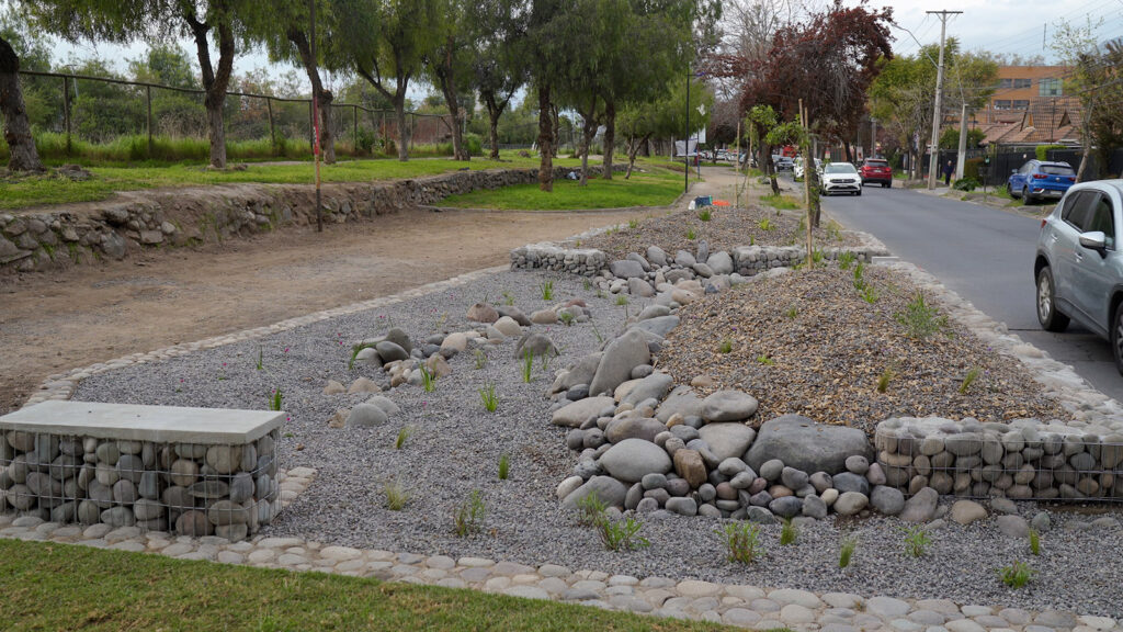 Esta solución sostenible y basada en la naturaleza fue implementada en la ribera oriente del canal San Carlos, una zona históricamente propensa a inundaciones debido al agua que corre desde las quebradas de la precordillera en eventos de lluvias intensas. La intervención consistió en un enfoque integrado que combinó técnicas de paisajismo y manejo del relieve para maximizar la infiltración y el aprovechamiento del agua.